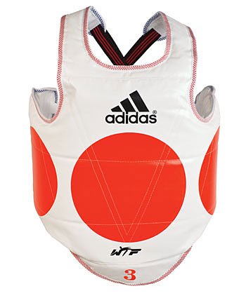 WTF approved body protector. The durable chest guard features lightweight, high-density foam in aTraditional design. Reversible red/blue dot with lace up design.