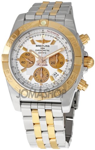 Stainless steel and two-tone (stainless steel and gold) bracelet. Unidirectional rotating bezel. Silver dial with gold-tone hands and index hour markers. Tachymeter scale around the outer rim. Date display appears between the 4 and 5 o'clock position. Chronograph - three gold sub-dials displaying: 12 hours, 30 minutes and 60 seconds. Automatic movement. Scratch resistant sapphire crystal. Screw locked crown. Case diameter: 43.5 mm. Case thickness: 17 mm. Deployment clasp. Water resistant at 500 meters/ 1650 feet. Functions: hours, minutes, seconds, date, chronograph, tachymeter. Breitling Chronomat B01 Silver Dial Automatic Mens Watch CB011012-G687TT.