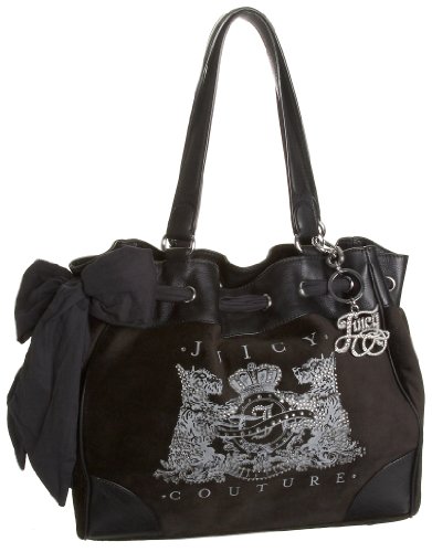 This soft velour handbag features leather trim and a printed fabric lining. 26" dual handles with an 8 drop. Magnetic snap-top closure, ribbon bow through leather trim. Crystal embellishments. Interior and exterior pockets. Dimensions: 13" W x 11" H x 4" D. By Juicy Couture.